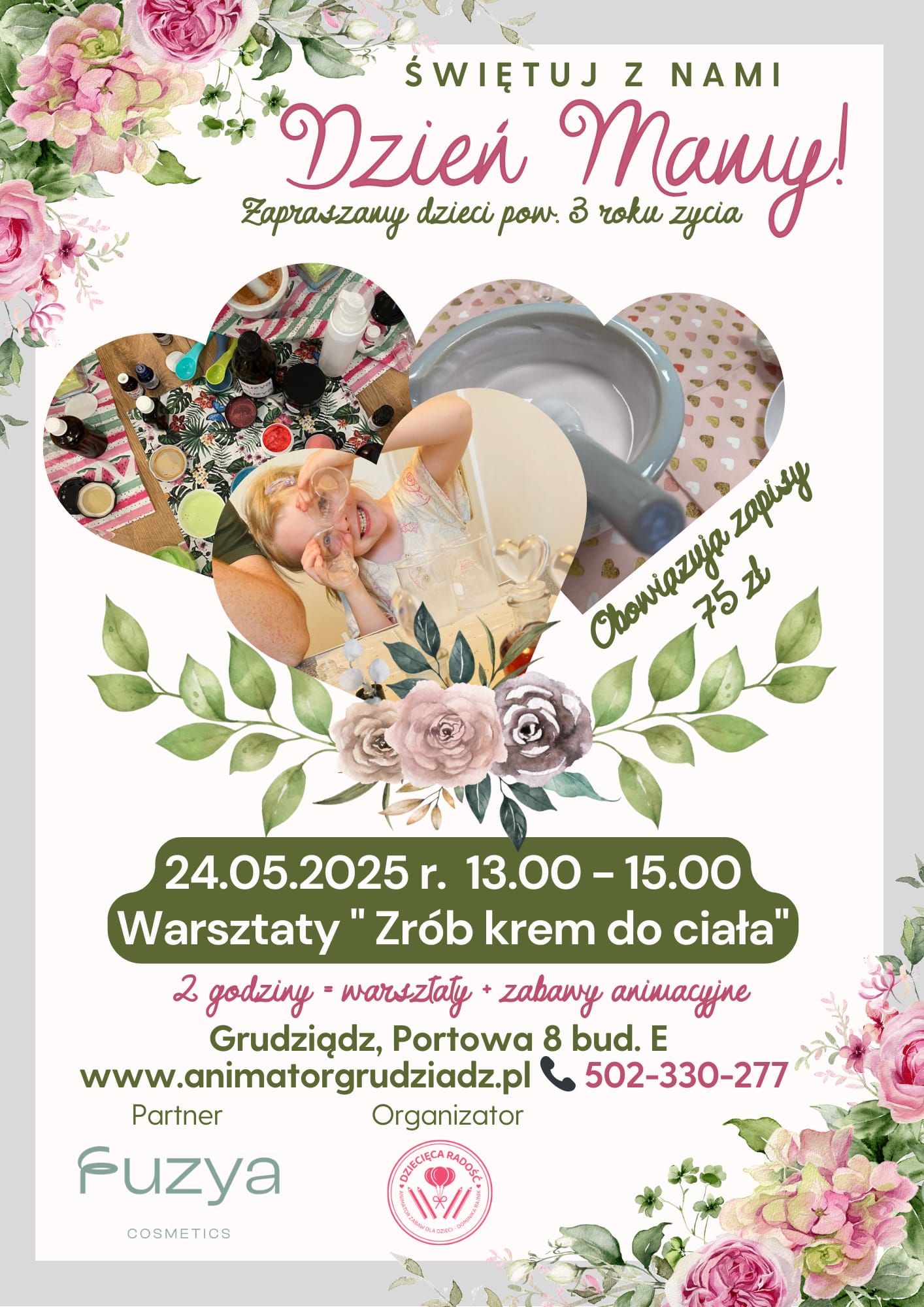 Zbliża się Dzień Mamy – święto pełne miłości, wdzięczności i ciepła. To doskonała okazja, aby spędzić czas kreatywnie i radośnie. Dlatego zapraszamy wszystkie dzieci powyżej 3. roku życia na wyjątkowe warsztaty tworzenia kosmetyków naturalnych, przygotowane we współpracy z marką FUZYA Cosmetics!