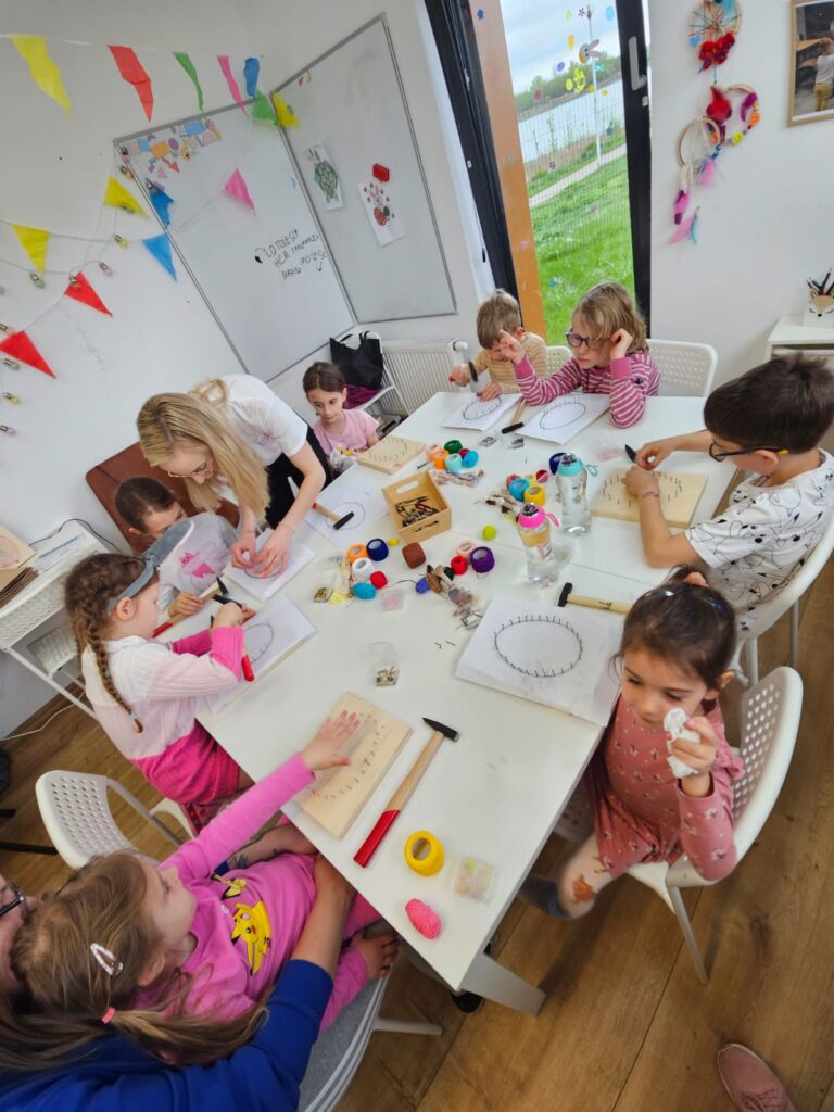 Następnie wspólnie z Patrycją z Fabryki Zabawy przeprowadziłyśmy wyjątkową aktywność – String Art. Jest to technika tworzenia obrazków za pomocą naciągniętych nici, które układa się wokół gwoździ wbitych w drewnianą tablicę. Dzieci wykonały tą metodą wielkanocne jajka – piękne, kolorowe i bardzo efektowne. Praca wymagała skupienia i precyzji, ale efekt końcowy był absolutnie wart tego wysiłku!